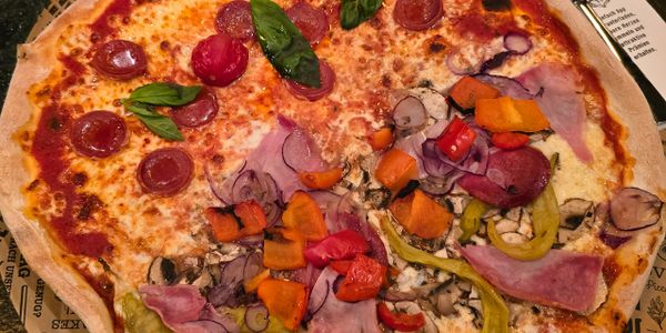 Homemade pizza sauce, Mozzarella cheese, Spinach, Tomato, Mushrooms, Red onion, Cheddar cheese.